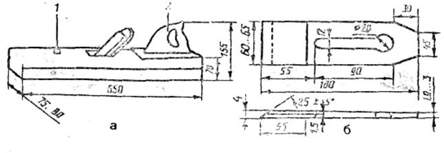 а — общий вид; б — нож фуганка; 1— пробка; 2— ручка.
