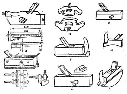 а — фальцгебель; б — шпунтубель; в — грунтубель; е — гальтель; 9 — штап; е — калевка; ж — горбач с вогнутым корпусом; а — горбач с выпуклым корпусом.