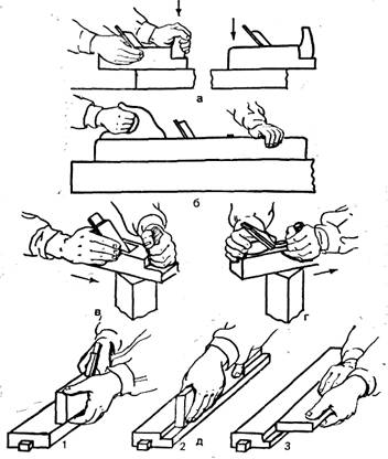 а — Рубанком; б — фуганком; «— торцевое строгание от себя; г — торцевое строгание к себе; д — отборка четверти зензубелем; 1— начальная нарезка; 2— отборка четверти; 3— зачистка четверти.