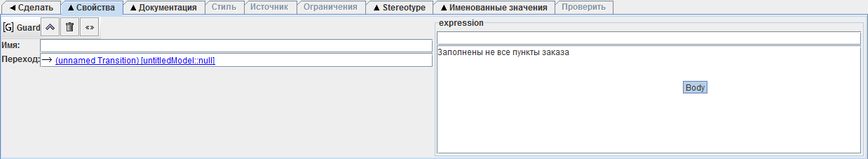 New Transition. После добавления перехода или при его выделении, под областью диаграммы открывается окно редактирования перехода.