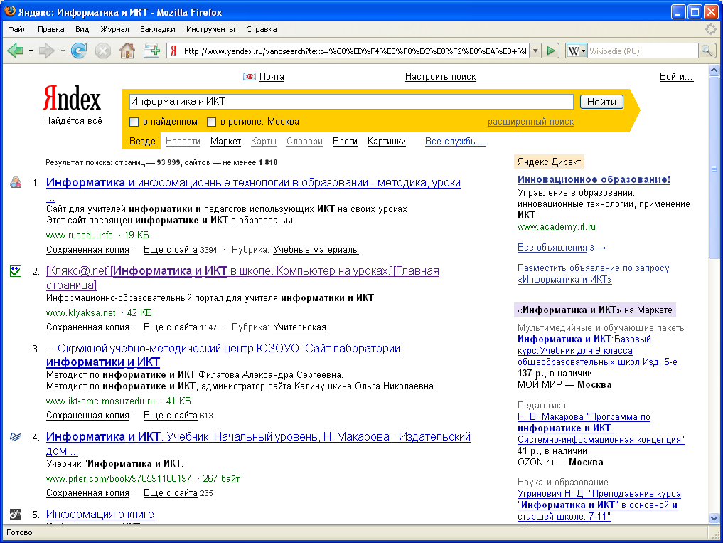 Индекс Яндекс: поиск по запросу "Информатика и ИКТ"