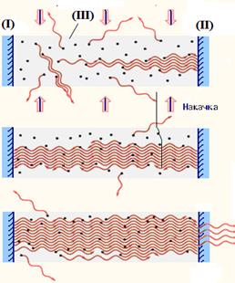 Рисунок 2 - Развитие лавинообразного процесса генерации в лазере. Приведен вариант с плоскопараллельными зеркалами (плоский резонатор), y одного из отражателей (I) r 1 = 1 («глухое» зеркало), y второго (II) r 2 < 1, его называют выходным. Между отражателями резонатора – активная (рабочая) среда (III)