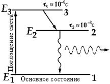 Рисунок 3 - Трехуровневая схема оптической накачки. Указаны параметры t2 и t3, обычно называемыми временами жизни состояний 2 и 3 с энергиями E 2 и E 3. Уровень E 2 – метастабильный. Переход между уровнями E 3 и E 2 безызлучательный. Лазерный переход осуществляется между уровнями E 2 и E 1. В кристалле рубина уровни E 1, E 2 и E 3 принадлежат примесным ионам хрома