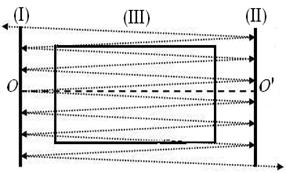 Рисунок 4 - Ход лучей в случае наклона по отношению к оси открытого резонатора: (I) и (III) – отражатели, (II) – активный элемент