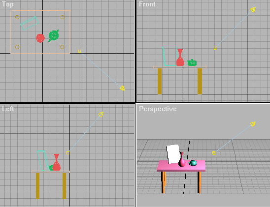 Задание 1 – Загрузите или создайте рисунок. Создайте Нацеленный прожектор. Нацельте его на объект, передвигая цель и камеру в окнах проекций.