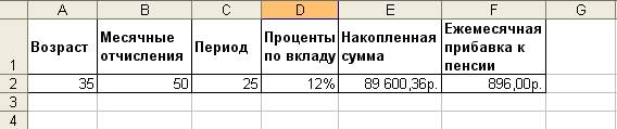 В этой таблице указаны возраст, начиная с которого в пенсионный фонд вносятся платежи (А2), величина ежемесячного взноса (В2), период отчислений, рассчитанный по формуле: