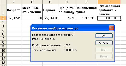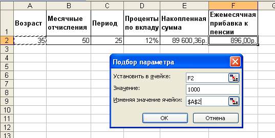 Допустим, нам необходимо определить, в каком возрасте будущему пенсионеру надо начинать выплаты, чтобы потом получить прибавку к пенсии в размере 1000 руб. Для этого следует выделить ячейку, отведенную для представления результата (в нашем случае F2), и вызвать команду Сервис/Подбор параметра. Когда появится диалоговое окно Подбор параметра (рис. 2), адрес выделенной ячейки будет автоматически вставлен в поле Установить в ячейке. Укажите в поле Значение целевое значение - 1000. Поместите курсор ввода в поле Изменяя значение ячейки и выделите ячейку А2, после чего ее адрес отобразится в указанном поле.