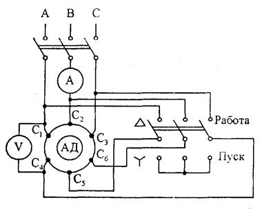 Чтобы убедиться в уменьшении тока при пуске переключением обмотки статора со звезды на треугольник, нужно пустить двигатель при соединении обмотки статора звездой и, не допуская остановки ротора, быстро перевести пакетный переключатель ПП в положение, при котором обмотка статора окажется соединенной треугольником. При пуске двигателя по амперметру заметить наибольший пусковой ток.