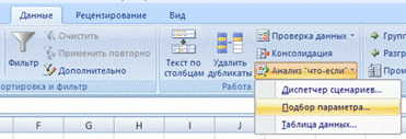 Когда желаемый результат вычислений по формуле известен, но неизвестны значения, необходимые для получения этого результата, можно воспользоваться средством Подбор параметра, выбрав вкладку Данные/Анализ что-если/ Подбор параметра.