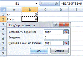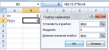 · стоящей в уравнении слева от знака равенства. В качестве аргумента используем ссылку на ячейку B1, т.е. =B1^2-5*B1+6. В B1 введем значение 0.
