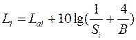 где Lai – уровень звука источника шума, дБА; Si – площадь воображаемой поверхности, окружающей источник шума и проходящей через расчетную точку (для небольших источников Si = pri2), м2; ri - расстояние от акустического центра источника шума до расчётной точки, м; В – постоянная помещения, определяемая по табл.2 и рис.1 Приложения, м2.