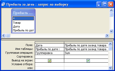 Мы добились учета прибыли магазина по виду товара за определенную дату. Теперь необходимо учесть полную прибыль магазина по дате. Для этого применяется функция группировки в создаваемом запросе. В такой запрос обычно вставляют поле или поля, по которым будет производиться группировка и поле, которое по этим группировкам необходимо учитывать. В нашем случае группировать мы будем по полю Дата, а учитывать (применяя функцию суммы) поле, построенное в предыдущем запросе.