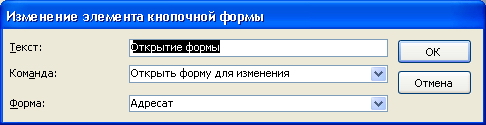 6. В появившемся окне (изменение элемента кнопочной формы), выберите, используя кнопки выпадающего списка: