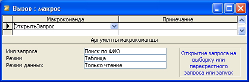 4. В поле Аргументы макрокоманды выберите имя открываемого запроса, его режим (таблица), и режим данных (только чтение).