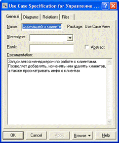 · General — здесь задаются общие свойства варианта использования: имя (Name), стереотип (Stereotype), приоритет (Rank), является ли прецедент абстрактным (Abstract) и текстовое описание прецедента (Documentation);