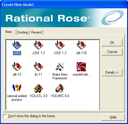 Работа с Rational Rose начинается с создания модели. При запуске программы автоматически появляется диалоговое окно для создания модели (рис. 1). Для его вызова также можно выбрать пункт меню File -> New. Во вкладке New выбираем необходимый каркас (в нашем случае J2EE). Во всех лабораторных работах мы будем создавать диаграммы для созданной модели.