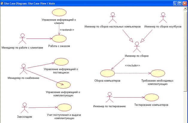 Для прецедента Сборка компьютеров не имеет значение какой именно актер будет с ним взаимодействовать - Инженер по сборке настольных компьютеров или Инженер по сборке ноутбуков. Поэтому мы ввели еще одного актера - Инженер по сборке, с которым связали первых двух актеров отношением обобщения (Generalization).
