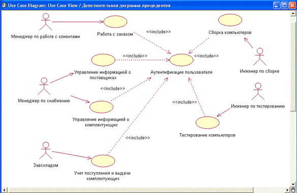 Отношение между прецедентами Сборка компьютеров и Требование необходимых комплектующих - отношение включения, поскольку для сборки компьютеров обязательно нужно заказывать необходимые комплектующие со склада.
