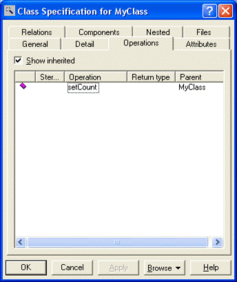 Для добавления новой операции к классу необходимо открыть спецификацию класса и выбрать вкладку Operations (рис. 6):