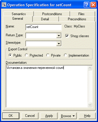 · General — задаются общие свойства атрибута: имя (Name), тип возвращаемого значения (Return Type), показывать ли все классы пакета (Show classes), стереотип (Stereotype), видимость операции за пределами ее класса (Export Control) и текстовое описание операции (Documentation);