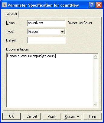 - General — здесь задаются имя параметра (Name), тип (Type), значение по умолчанию (Default) и текстовое описание параметра (Documentation).