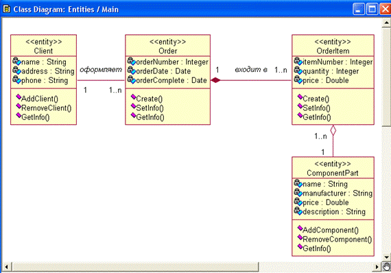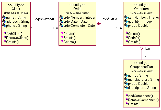 Создадим классы-сущности Order (Заказ), Client (Клиент) и ComponentPart (Комплектующее изделие). Поскольку в один заказ может входить много разных комплектующих изделий, и одно комплектующее изделие может входить во много заказов, то введем еще один класс-сущность OrderItem (Состав заказа). Опишем каждый класс.