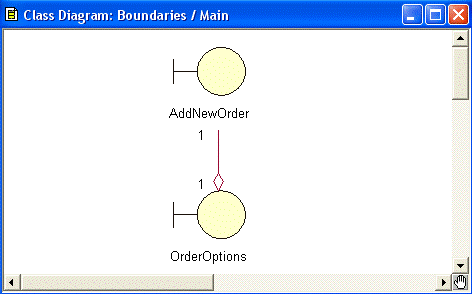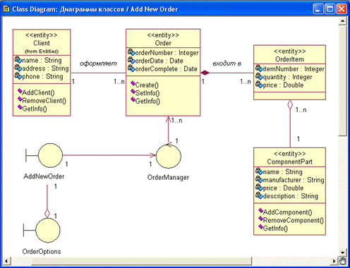 Добавим теперь на диаграмму граничные и управляющие классы (рис. 3). Рассматриваемый сценарий - это только одно из действий, которые обеспечивает прецедент "Работа с заказом". Прецедент также позволяет просмотреть, отредактировать или удалить заказ. Это означает, что необходимо предусмотреть механизм, который позволяет выбирать необходимое действие. Создадим для этого граничный класс OrderOptions (Параметры работы с заказом) с комментарием " Класс, обеспечивающий механизм работы с заказами ". Также создадим граничный класс AddNewOrder (Добавление нового заказа), который будет служить для добавления новых заказов (комментарий - " Класс служит для добавления новых заказов ". Отношение между этими классами - агрегация, поскольку в данном случае класс AddNewOrder рассматривается как часть класса OrderOptions, частями которого также будут классы для просмотра, редактирования и удаления заказов. Кратность связи 1 к 1, поскольку в состав класса OrderOptions входит только один класс AddNewOrder.