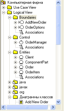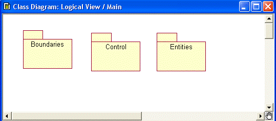 Пакеты предназначены для группировки элементов в группы по определенным критериям. В простейшем случае классы можно группировать по их стереотипам. Создадим три пакета: Entities (классы-сущности), Boundaries (граничные классы) и Control (управляющие классы). Для этого необходимо щелкнуть правой кнопкой мыши на Логическом представлении браузера (Logical View), в появившемся контекстном меню выбрать пункт New > Package (Создать > Пакет), и ввести имя пакета. Результат создания пакетов показан на рис.4: