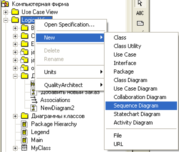 Для создания новой диаграммы последовательности необходимо щелкнуть правой кнопкой мыши на представлении Вариантов Использования браузера (Use Case View) или Логическом представлении (Logical View). В открывшемся меню выбрать пункт New > Sequence Diagram (Создать > Диаграмма последовательности) (рис. 1). Далее ввести название диаграммы, после чего дважды щелкнуть по ней в браузере, чтобы открыть ее.