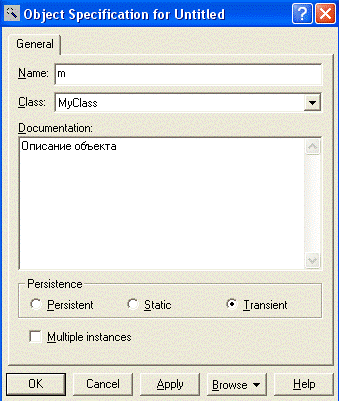 В окне спецификации для объекта можно задать: имя объекта (Name); класс, экземпляром которого является этот объект (Class), если класса еще нет в проекте, то здесь его можно создать, выбрав в выпадающем списке значение <New>; текстовое описание (Documentation); время жизни объекта (Persistence); является ли этот объект мультиобъектом (Multiple instances).