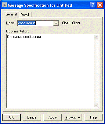 После создания сообщения можно определить его свойства. Для этого нужно дважды по нему щелкнуть или же вызвать для него контекстное меню и выбрать пункт Open Specification..., после чего откроется окно спецификации сообщения, содержащее две вкладки (рис. 3).