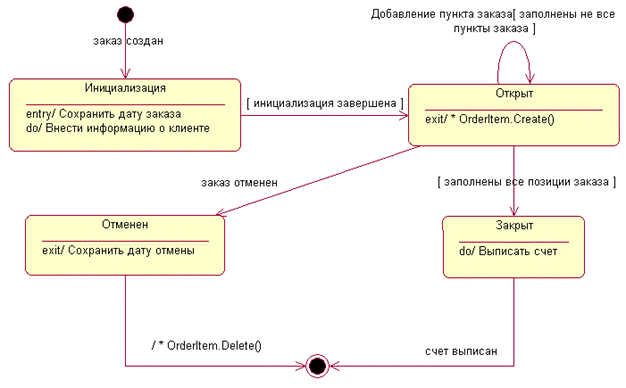 В состояние Отменен заказ переходит из состояния Открыт при наступлении события "заказ отменен". При выходе из него выполняется действие выхода "Сохранить дату отмены". При переходе из этого состояния в конечное выполняется действие "* OderItem.Delete()" (удаление пункта заказа). Здесь также стоит "*", поскольку это действие будет выполняться много раз.