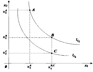 Рис. 2.7. Графическое представление изменения предпочтений потребителя для случая набора из двух благ.