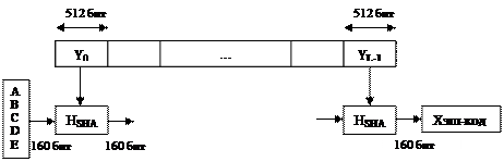 Результатом первых двух шагов является сообщение, длина которого кратна 512 битам. Расширенное сообщение может быть представлено как последовательность 512-битных блоков Y0,Y1,…,YL-1, так что общая длина расширенного сообщения есть L· 512 бит. Таким образом результат кратен шестнадцати 32-битным словам.