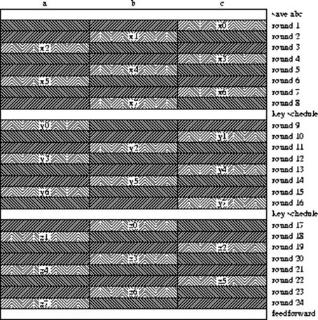 Таблица хеширования описывает функцию Tiger. Переменные y0, y1,..., y7 и z0, z1,..., z7 определяют значения x0, x1,..., x7 на втором и третьем этапах, соответственно. В итоге, значения регистров состояния Hn является выходным значением Tiger/192.