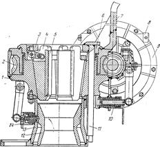 1-корпус автомата; 2- червячное колесо; 3- клиньевая подвеска: 4- корпус клина; 5- плашка; 6-опорный фланец; 7-водило; 8- вал вилки включения маховика; 9- электроинерционный привод; 10 - ось балансира; 11 - направление клиньевой подвески; 12 - центратор; 13- пьедестал центратора; 14 - фиксатор центратора