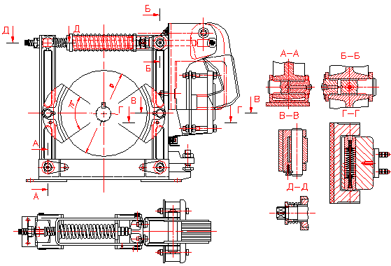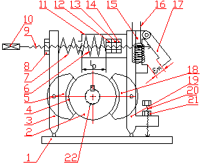 Нормально замкнутый колодочный тормоз (рис.4.1) тормозит при выключении двигателя механизма. Пружина сжатия 6 прижимает тормозные колодки 5 и 18, шарнирно закрепленные на рычагах 3 и 19 к тормозному шкиву 2, установленному на затормаживаемом валу 22. Ярмо 15 электромагнита и скоба 11 закреплены на рычаге 19.