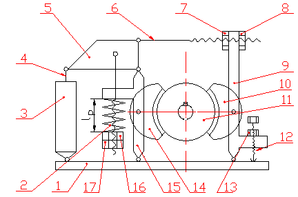1. Регулировку момента Tm, создаваемого тормозом, осуществляют установкой расчетной длины lр пружины 2 гайкой 16 и контргайкой 17.