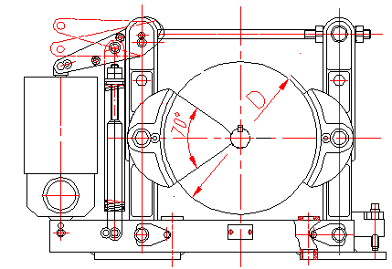 3.Регулировку одинаковых отходов колодок от шкива осуществляют винтом 12, ограничивая отход рычага 9 до упора винтом 12 в основании 1 таким образом, чтобы отход колодки 10 составлял половину суммарного отхода колодок. По окончании регулировки винт 12 стопорят контргайкой 13.