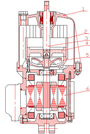 1-корпус; 2- внутренний цилиндр; 3- шток; 4- поршень; 5- центробежный насос; 6- электродвигатель.