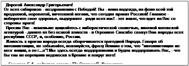 Кремлёвские временщики не просто посягают на нашу светлую и благодарную память о Сталине, о наших отцах-победителях, с его именем поднимавшихся в атаку, с его профилем носивших боевые награды. Власть прикупившие посягают на наш национальный дух, истребляют нашу национальную волю, крепнущую памятью о Сталине, памятью о героических боях трагичной и великой Отечественной войны, Верховным Главнокомандующим которой был Сталин.