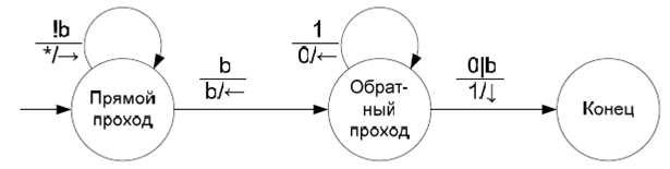 На рис. 1.6 представлен граф переходов управляющего автомата машины Тьюринга, реализующей функцию инкремент. Здесь символ ‘b’ – сокращение от blank, символ ‘*’ на месте записываемого символа означает «записать тот же самый символ, который был считан». Команды головке обозначаются стрелками (стрелка вниз означает «остаться на месте»).