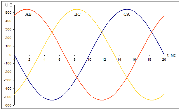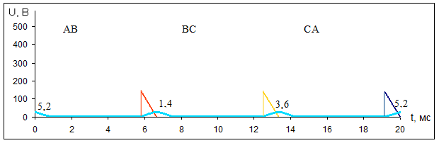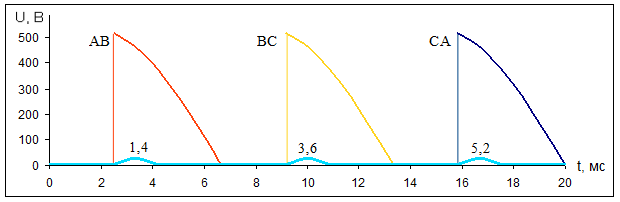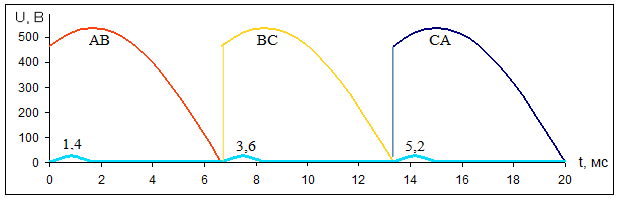 После включения тумблера на нагрузку подается трехфазное напряжение пилообразной формы (см. ниже). Напряжение регулируется потенциометром от 20 до 220 В. На индикаторе «Работа ХХХВ ХХХА» (m2), где ХХХВ — текущее значение напряжения, ХХХА — текущее значение тока, измеренные датчиками напряжения и тока.