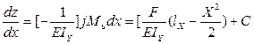 При выбранном положительном направлении изгибающих моментов знак плюс будет, если ось аппликат Z направлена вверх, а выпуклость изогнутой положительными моментами Ми. оси балки - вниз. Рассчитаем прогиб балки (рис. 4), для которой Mu = F(l – x), После первого интернирования дифференциального уравнения (12) имеем