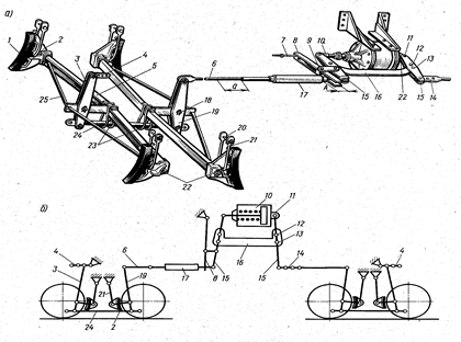 При торможении корпус регулятора 17 упирается в рычаг 8, соединенный с горизонтальным рычагом 15 затяжкой 9. Винт 7 служит для регулировки размера А.