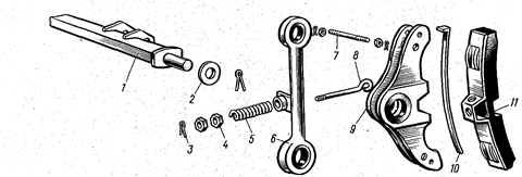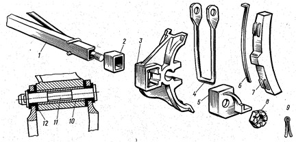 1 —триангель; 2 —закладка; 3— башмак; 4— подвеска; 5 —предохранительный, наконечник; 6— чека; 7—чугунная колодка; 8 — корончатая гайка; 9 — шплинт; 10 — втулка; 11 — валик подвески; 12 — резиновая втулка