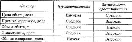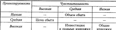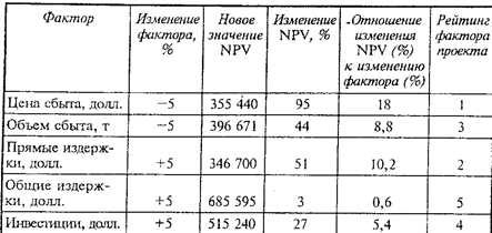 Анализ чувствительности (табл. 12.2, 12.3) показывает, что наиболее "опасными " для проекта факторами являются цена и объем сбыта, тогда как изменение остальных выбранных для анализа факторов не оказывает столь существенного влияния на эффективность проекта. Кроме того, проведенные расчеты позволяют утверждать, что уменьшение цены сбыта или увеличение прямых издержек более чем на 5% отрицательно влияют на эффективность проекта, измеряемую по критерию чистого дисконтированного дохода NРV. К аналогичному результату приводят сокращение объема сбыта более чем на 10%, увеличение инвестиций более чем на 15%, тогда как даже 50%-ное изменение общих издержек не приводит проект к краху.