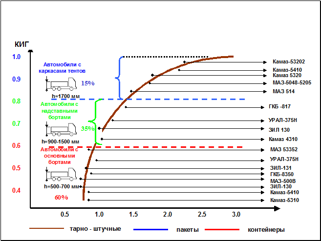 - наиболее актуальной является проблема эффективности использования подвижного состава. Если учесть, что среднее значение коэффициента использования пробега для транспорта общего пользования составляет 0,49, коэффициента использования грузоподъёмности – 0,72, то выходит, что потенциальные возможности автомобиля используются только на 35%. Если же при этом учесть, что в основном подвижной состав автопредприятий работает в одну смену, зачастую неполный рабочий день, а до 40% рабочего времени простаивает под загрузкой – разгрузкой, то становится очевидным, что эта проблема также ждет своего решения. Значения зависимости КИГ от удельного объема бортовых платформ и способов формирования грузовых единиц приведены на рисунке 2.
