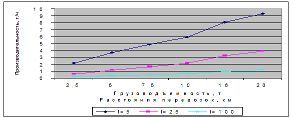 Из полученных графиков следует, что увеличения производительности можно добиться в первую очередь за счёт увеличения грузоподъёмности автомобиля и коэффициента использования грузоподъёмности (применение автомобилей большей грузоподъёмности, прицепов, наращивание бортов).