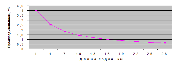 Рисунок 5. Зависимость производительности подвижного состава от расстояния перевозок.